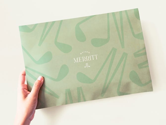 J’ai accompagné Maison Merritt, une jeune marque de vêtements de golf pour femmes, dans la création de son packaging. Distribuée exclusivement aux États-Unis, la marque incarne une nouvelle vision du golf : plus audacieuse, féminine et contemporaine. Perri et Jill souhaitent faire évoluer les codes traditionnelles de ce milieu, notamment pour les femmes.