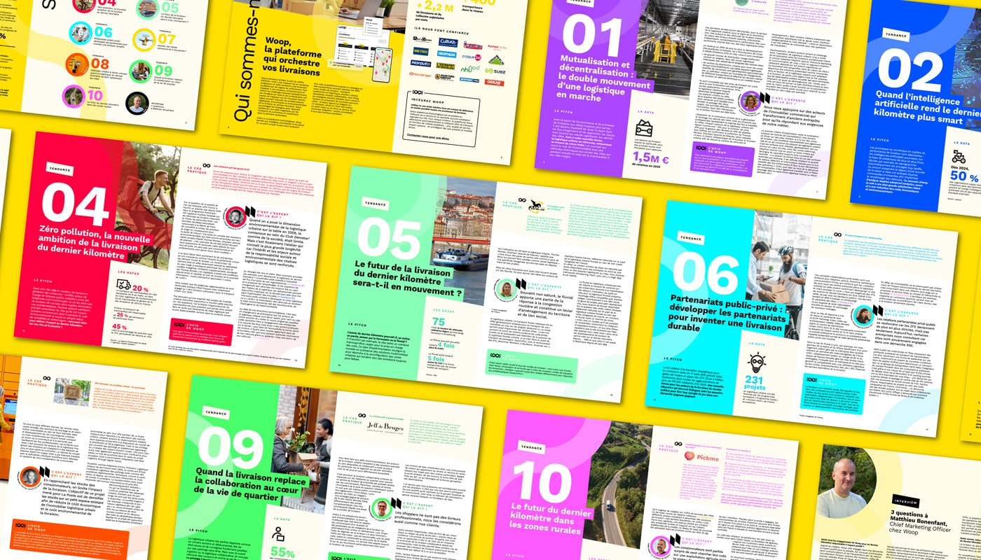 Dès la couverture, se dessinent des lignes qui symbolisent le chemin et le mouvement qui se poursuivent tout au long des pages. Ces lignes sont bien plus qu’un élément esthétique : elles incarnent la raison d’être de Woop. À l’image des parcours de livraison optimisés par Woop, elles symbolisent le trajet, le flux et le lien entre les enseignes, les transporteurs et les clients finaux.
