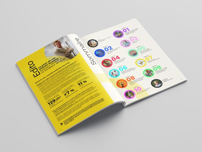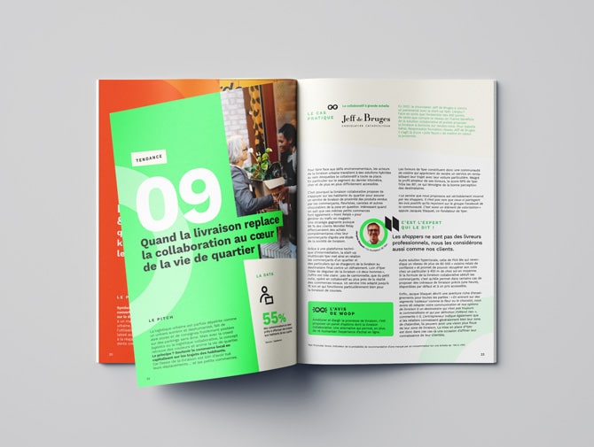 La direction artistique du carnet de tendances s’appuie sur la charte graphique de la marque, utilisant des couleurs vives et dynamiques pour renforcer l’identité visuelle.