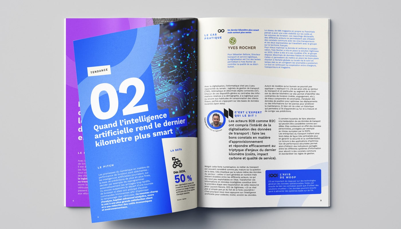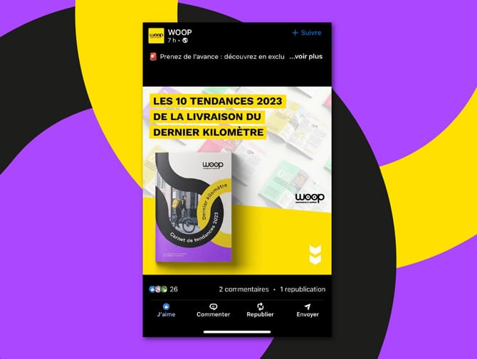 Woop est une entreprise spécialisée dans la gestion et l’optimisation des livraisons du dernier kilomètre. Grâce à sa plateforme technologique, Woop connecte les enseignes à un large réseau de transporteurs pour proposer des livraisons plus rapides, plus flexibles et plus durables. Elle souhaite s’imposer sur le marché en diffusant un carnet de tendances sur la livraison du dernier kilomètre.